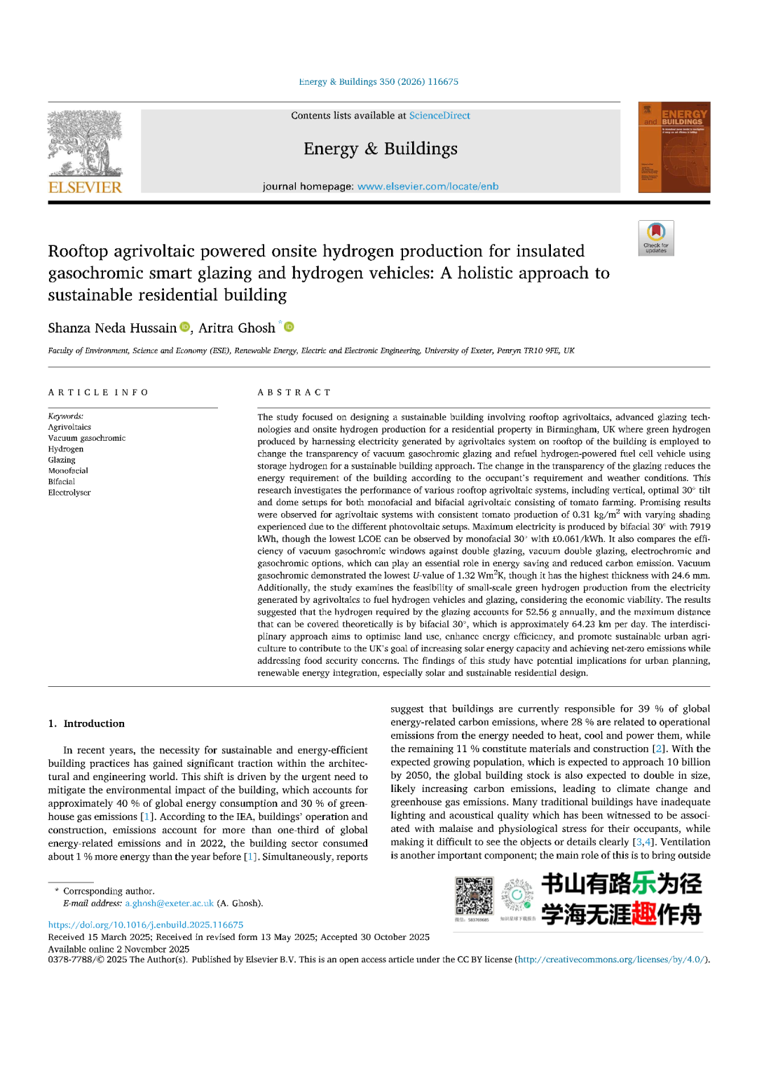 该研究重点是设计一座可持续建筑,结合屋顶农业、先进玻璃技术和现场氢气生产,应用于英国伯明翰一处住宅,利用建筑屋顶农业伏发系统产生的绿色氢气,改变真空气酸变色玻璃的透明度,并利用储氢为氢燃料电池车辆加注燃料,实现可持续建筑方案。玻璃透明度的变化根据居住者的需求和天气条件降低了建筑的能源需求。