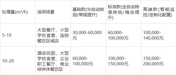 2.10-20m³/h流量场景(酒店后厨、商业综合体餐饮区):建议选用高端款智能设备,预算150,000-200,000元,配置304或316不锈钢材质+全智能控制系统+恒温加热+模块化设计,适配多商户集中排水、水质复杂的场景,确保长期稳定运行且符合环保合规要求。