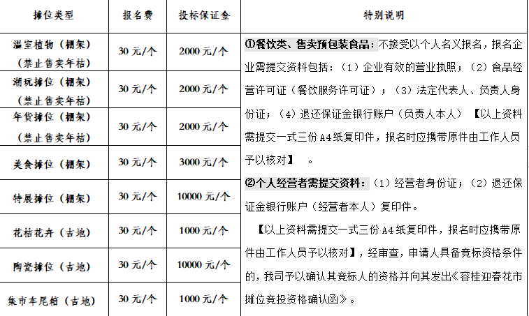 投标保证金:根据摊位类型缴纳,中标后可转为摊位押金,未中标者全额无息退还。