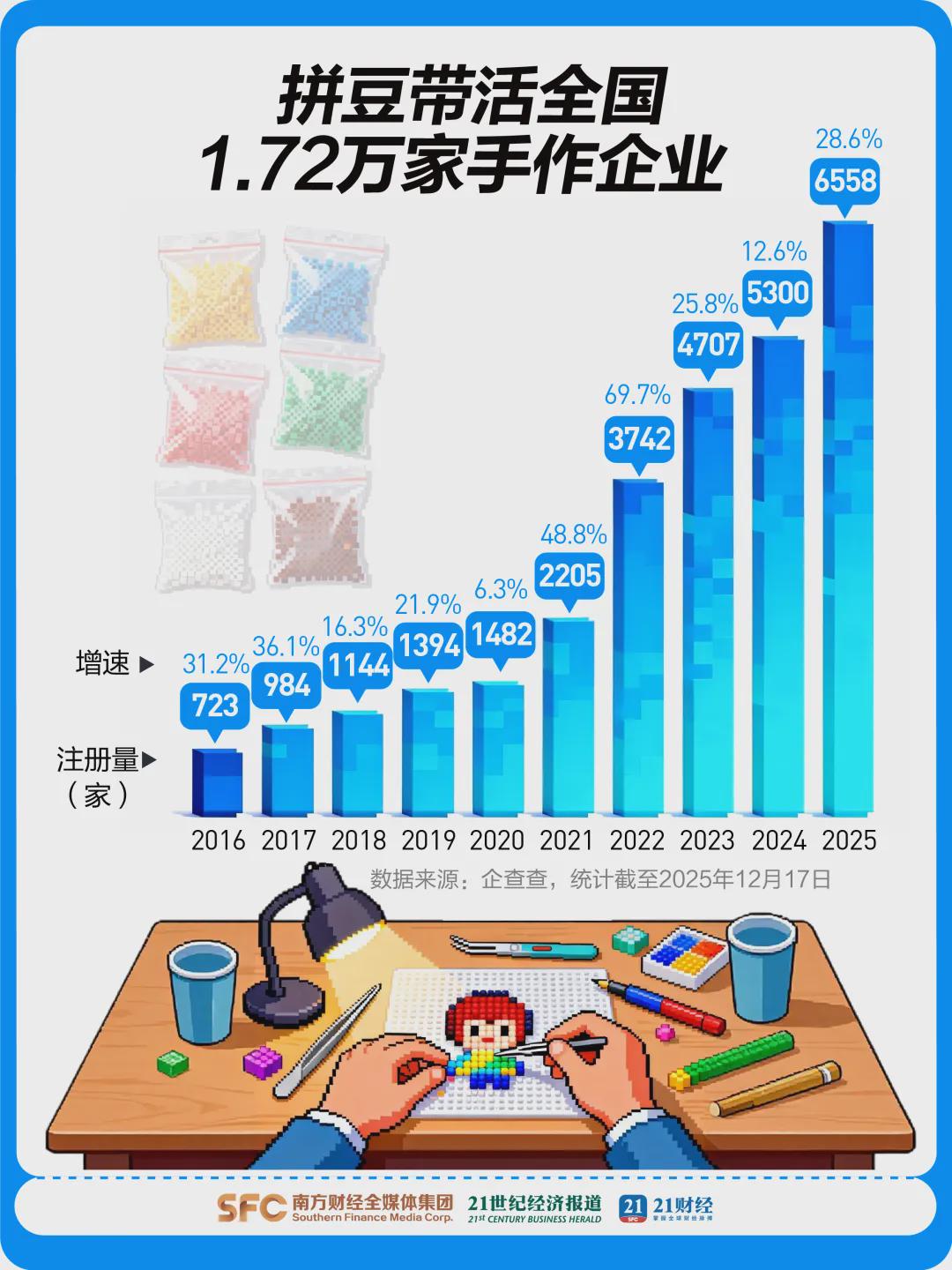 企查查数据显示,截至去年12月17日,国内现存手作相关企业1.72万家。2022年注册量同比激增69.7%,而2025年至今注册量已达6558家,超过2024年全年,同比增幅28.6%。