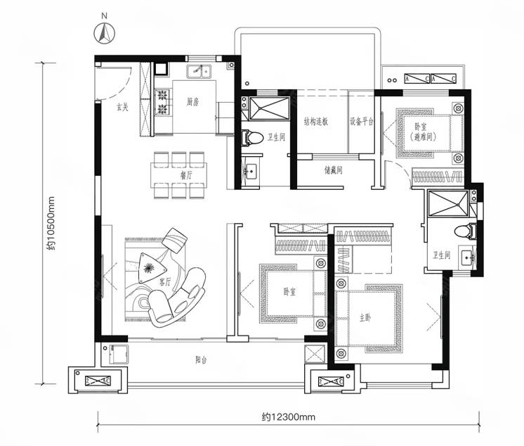 住宅产品户型面积约为 99-114-129-143 ㎡,采用 2T4北连廊设计,南北通透,全明设计,户型整体设计较为理想,可满足多元化客群置业需求。