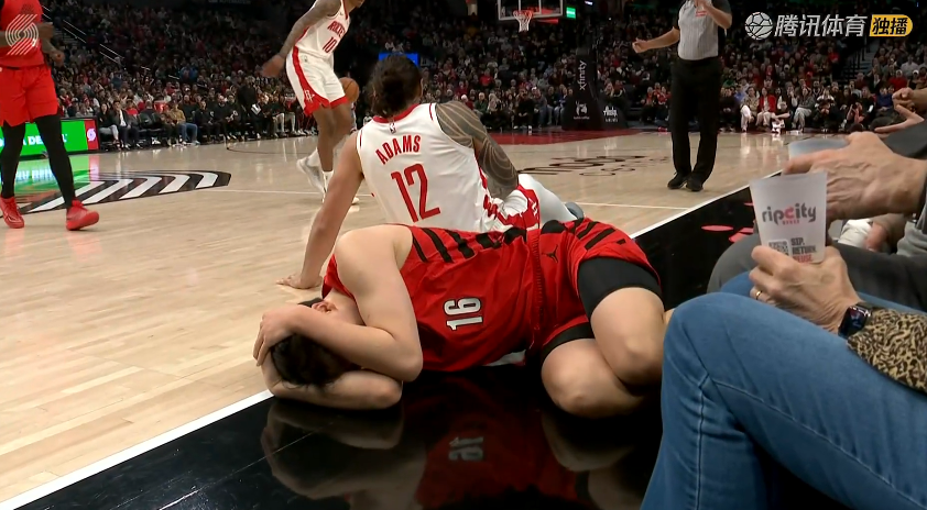 第二节开始,小杨继续留在场上,获得一次三分机会,可惜未能命中,防守端小杨和亚当斯继续纠缠,两人争抢球权先后摔倒在地,小杨还被亚当斯坐了一下,似乎头部再一次磕在地板上了。