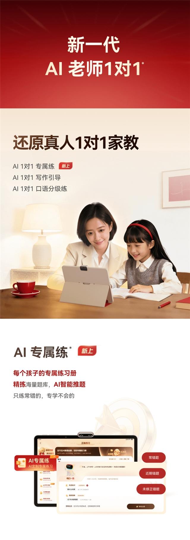 除此之外,AI 老师还具备作业辅导、个性化推题、学情数据分析等全面能力。7×24 小时在线的特性,让孩子遇到问题能即时得到解答,家长无需再为 “辅导不了”“没时间辅导” 发愁;精准的学情分析则能帮助家长清晰掌握孩子的学习状况,做到 “因材施教”,相当于花一份学习机的钱,就拥有了全年无休的私人家教,性价比远超传统辅导模式。