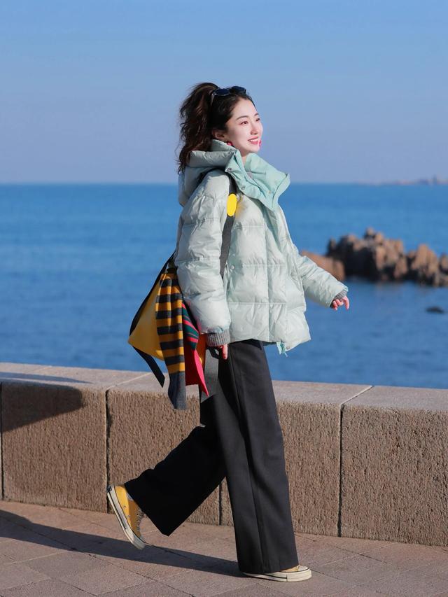 短款羽绒服利落干脆,搭配白色直筒长裤,视觉上瞬间拉长身形,完全不压个子。