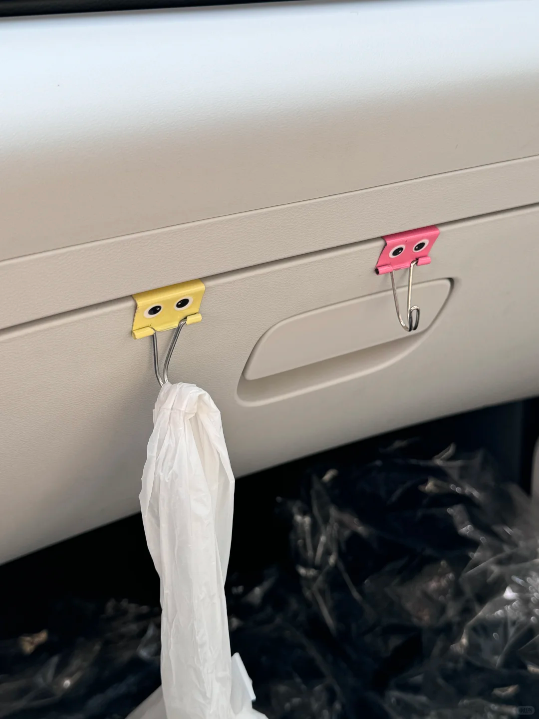 平常买的东西没有地方挂,全部都放在座椅上,很容易弄脏,直接挂在挂钩上面就方便多了,可以使用钳子将燕尾夹的弯成合适的挂钩形状,然后我只要夹在车的收纳箱的边缘就可以了,