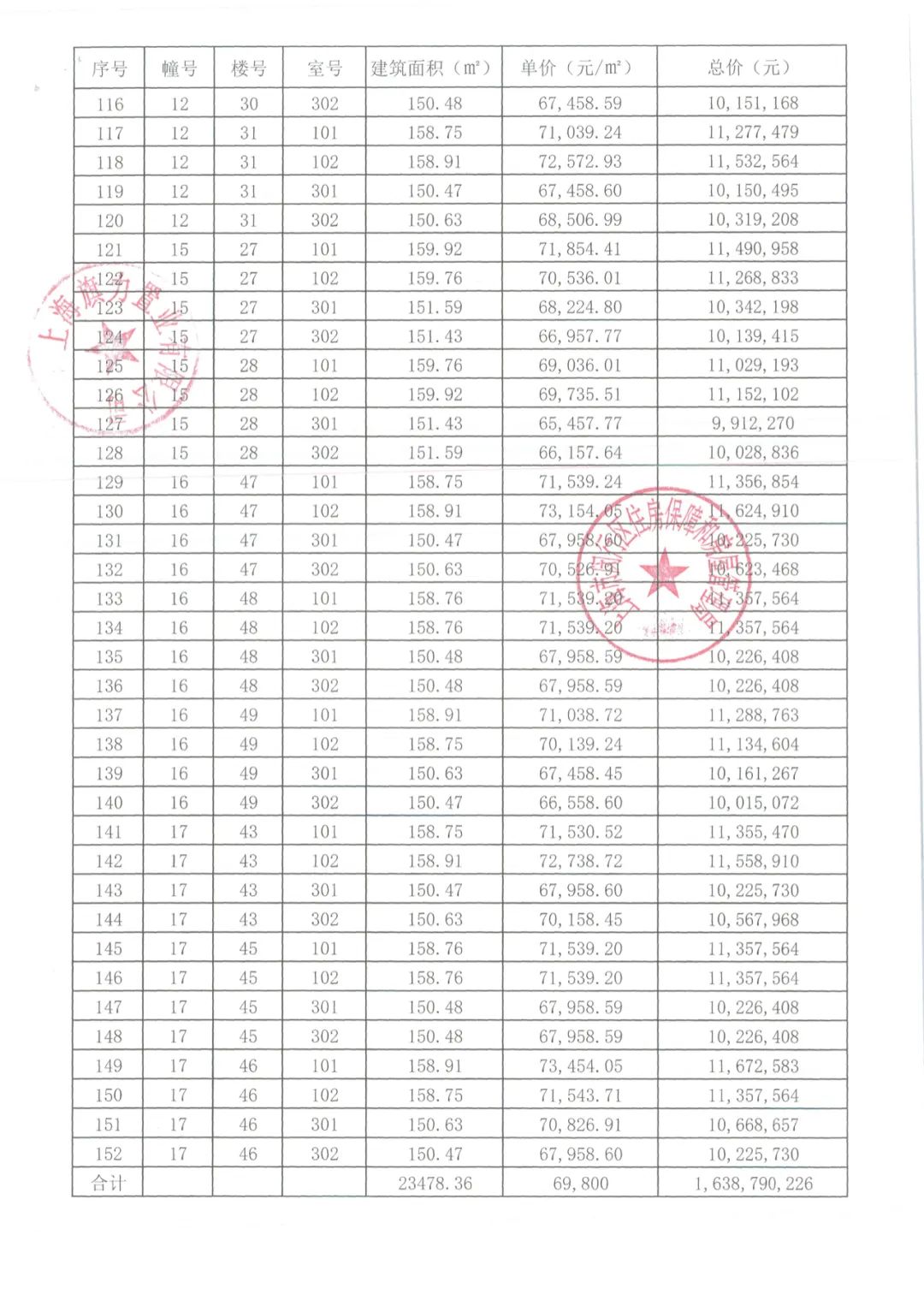 一房一价表如下