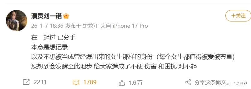 据南都娱乐,1月7日下午,网曝#檀健次 刘一诺#恋情,引发讨论。檀健次晒出视频,并配文:“三只单身狗”后,刘一诺发文回应:“在一起过,已分手。本意是想记录。以及不想被当成曾经爆出来的女生那样的身份(每个女生都值得被爱被尊重),没想到会发酵至此地步,给大家造成了不便、伤害和困扰,对不起。”