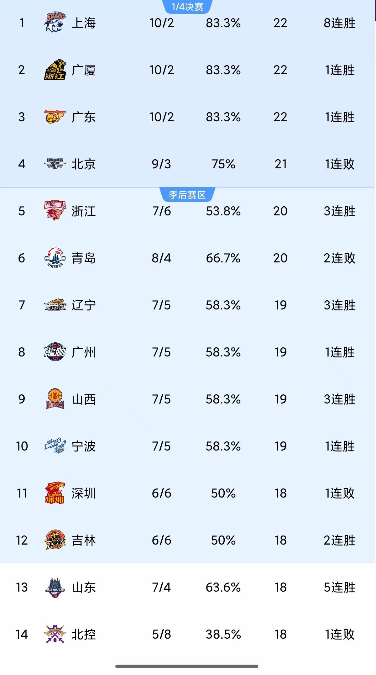 今晚三场比赛的分差分别是21分、30分、20分,全部是大比分赢球,确实堪称惨案之夜!传统强队浙江赛季低开高走,一波三连胜后已经从第十升至第五,看来浙江对的后劲很猛,注定成为四强搅局者!广州队今晚赢球后,战绩来到7胜5负追平辽宁,暂时排名第八,现在广东省三队都在前十二,分别是广东第三、广州第八、深圳第十一!辽宁队虽然暂时排名第七,但广州少赛一轮其实胜率更高,所以后续比赛辽宁要努力了,尤其明晚的辽粤大战,不然会再次掉出前八压力很大。下面就是最新积分榜排名: