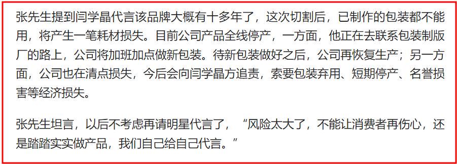 在媒体采访的最后,张先生透露公司除了与闫学晶做出切割,今后将会向闫学晶追责,索要包装弃用、短期停产、名誉损害等经济损失。