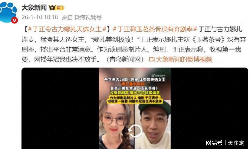 1月9日晚,编剧兼制片人于正在一场直播连麦中,将长达半小时的对话几乎变成了一场对古力娜扎的“极致赞美会”。面对镜头,于正毫不吝啬溢美之词,高频输出“美到极致”、“从未见过更好看”等评价,直言娜扎是其新剧《玉茗茶骨》中茶商世家千金“荣善宝”的“天选女主”,更抛出“虽不能说前无古人,但确实后无来者”的惊人论断,瞬间将娜扎的颜值推至舆论风暴眼。网友对此反应迅速,调侃道:“于丫头最懂观众想听什么了。”