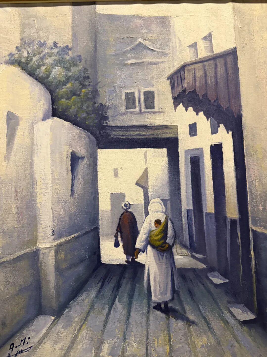 其次,画作的构图与题材充满了浓郁的地域风情与生活气息。在构图上,画家们常常以杜伊特本哈杜村的标志性建筑——层层叠叠的夯土房屋、高耸的瞭望塔、蜿蜒的小巷为主体,将沙漠、山脉、驼队等元素巧妙地融入画面,形成独特的空间层次感。他们的视角并非居高临下的俯瞰,也并非刻意选取的唯美角度,而是带着生活的温度,捕捉村落中最平凡却最动人的瞬间:清晨时分,村民在村口汲水的身影;黄昏时刻,孩童在夯土墙上追逐嬉戏的场景;夜幕降临,驼队在沙漠中渐行渐远的轮廓。这些题材看似普通,却充满了生活的质感与人文的温度,让观者仿佛能够穿越时空,置身于这座红土村落之中,感受柏柏尔人的淳朴与热情。
