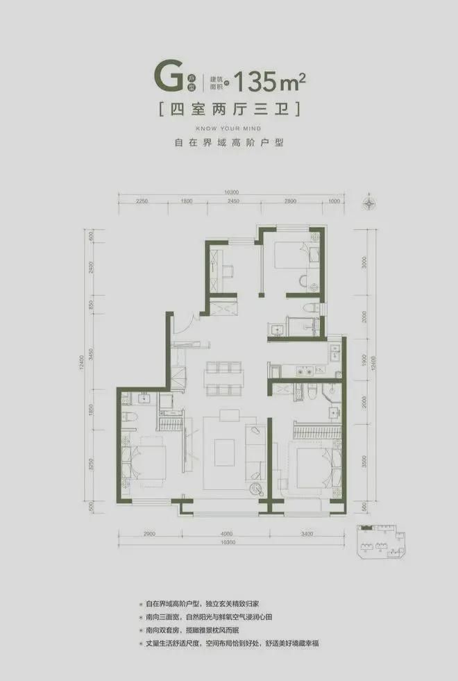 而135平方米的四居室,则更是将居住的尊贵与舒适推向了一个新的高度。三面朝南的设计,让阳光毫无保留地洒满整个房间,南向双套房的设计,既满足了居住者的私密性需求,又兼顾了家庭成员之间的相互照顾。客餐空间宽敞明亮,无论是周末的家庭聚会,还是日常的休闲时光,都能在这里找到一份宁静与惬意。