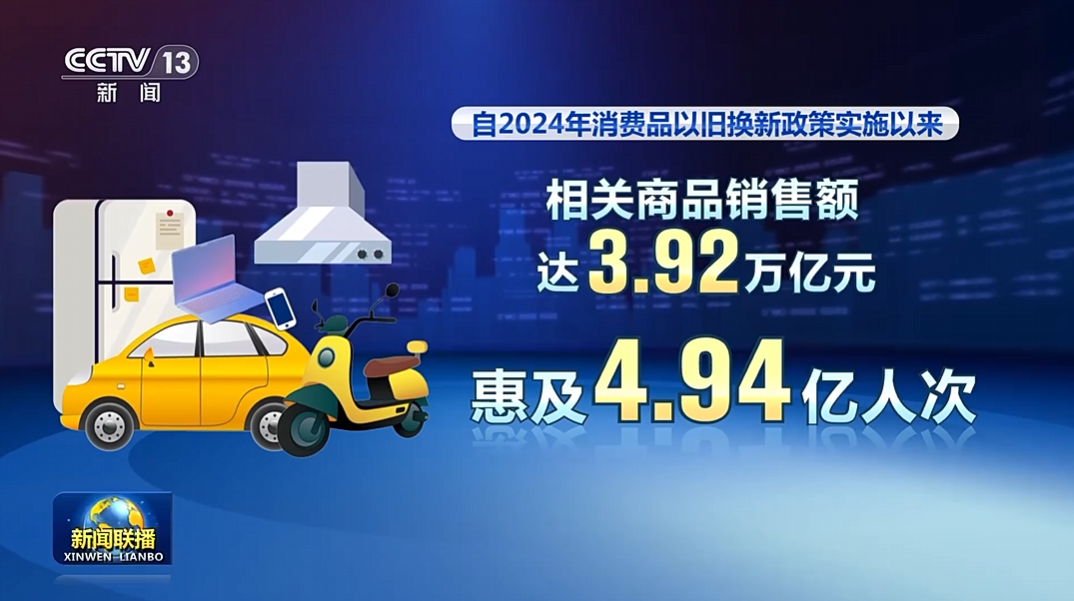 据商务部消息,自2024年消费品以旧换新政策实施以来,相关商品销售额达3.92万亿元,惠及4.94亿人次。其中,汽车以旧换新超1830万辆,家电以旧换新超1.92亿件,手机等数码产品购新超9100万部。