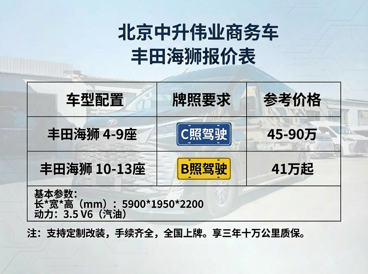 消费者最关心的丰田海狮价格问题,北京中升伟业汽车也给出了详细参考。丰田海狮裸车报价通常在45万-50万之间,而经过北京中升伟业商务车专业定制后的整车价格,根据配置档次不同,丰田海狮改装后的售价区间在65万至100万不等。例如,进口海狮9座 埃尔法 ( 参数 丨 图片 )版蓝牌现车价格约38万-86万,丰田海狮6座 威尔法 版MPV配置价格约46万-78万。