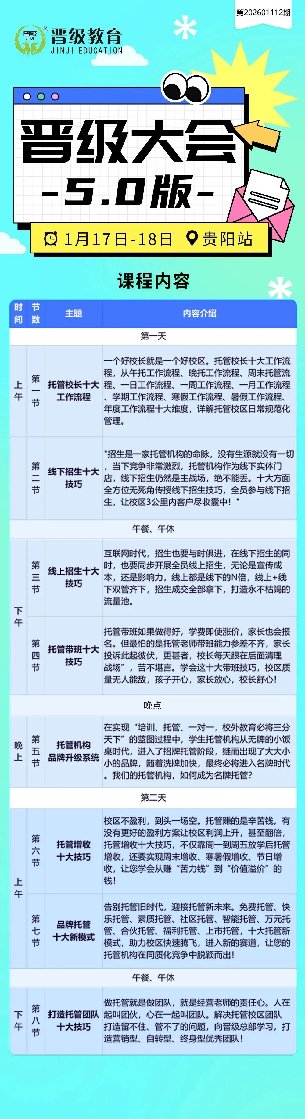 为切实解决托管机构日常运营痛点,本次晋级大会5.0版创新性推出8大核心模块与80个落地方法的课程体系,全面覆盖校长工作流程、线上线下招生带班技巧、品牌升级路径、增收策略与团队建设等核心内容。