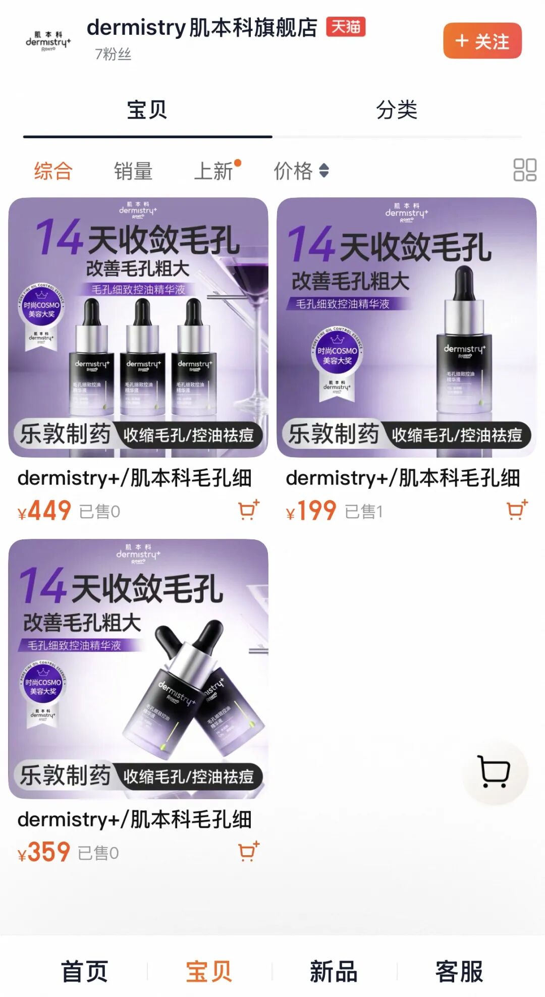 近日,聚美丽发现,在去年闭店的品牌肌本科,其天猫的店铺重新开业。粉丝数仅7人,店铺虽然上架了三个链接,但均为同一款精华液产品,单瓶价格为199元,商品页面显示已有两人付款。