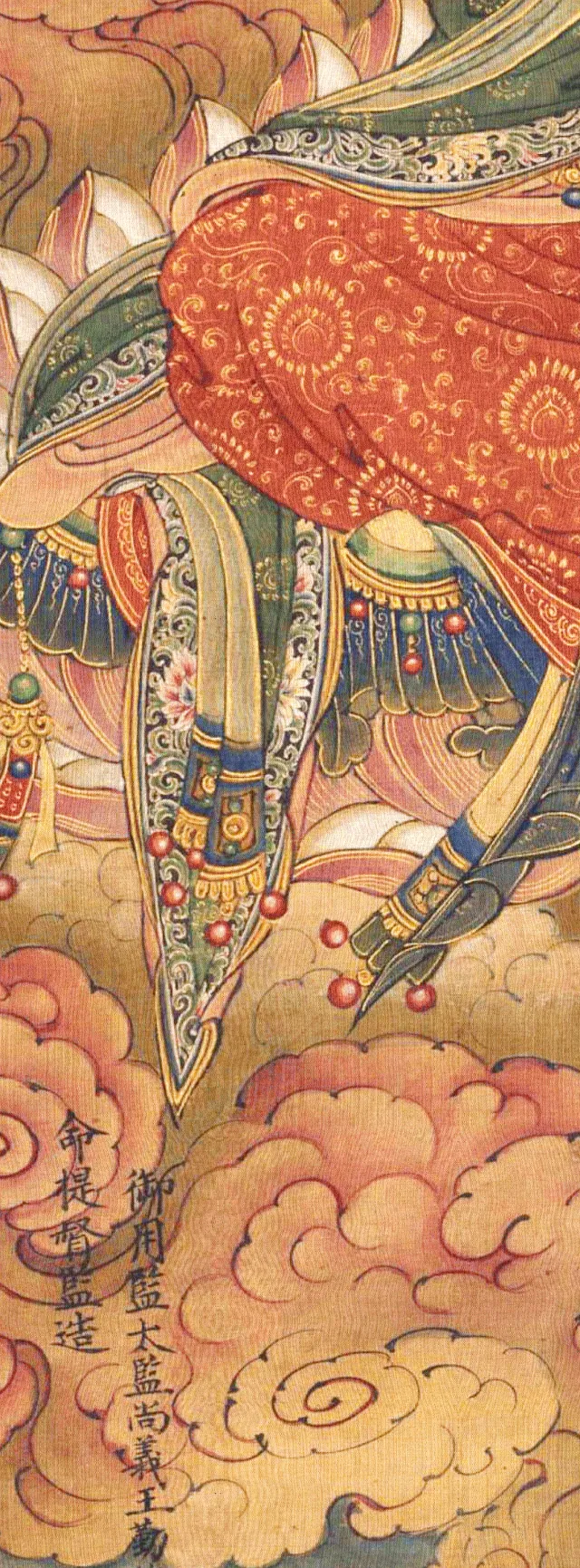 最绝的是构图——菩萨们端坐莲台,周围祥云缭绕,瑞兽伏卧,活像一场“菩萨选美大赛”的后台。画师还偷偷在右上角题了“大明景泰五年八月初三日施”,左下角盖了“广运之宝”的官印,生怕别人不知道这是皇家定制款。