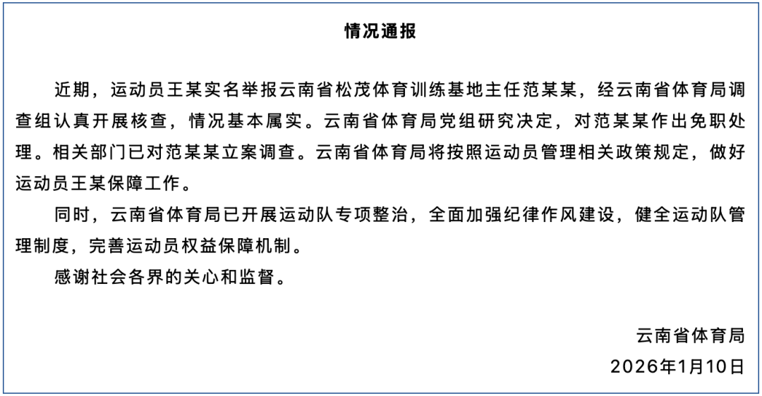 云南省体育局1月10日晚间发布情况通报。通报称,近期,运动员王某实名举报云南省松茂体育训练基地主任范某某,经云南省体育局调查组认真开展核查,情况基本属实。云南省体育局党组研究决定,对范某某作出免职处理。相关部门已对范某某立案调查。云南省体育局将按照运动员管理相关政策规定,做好运动员王某保障工作。