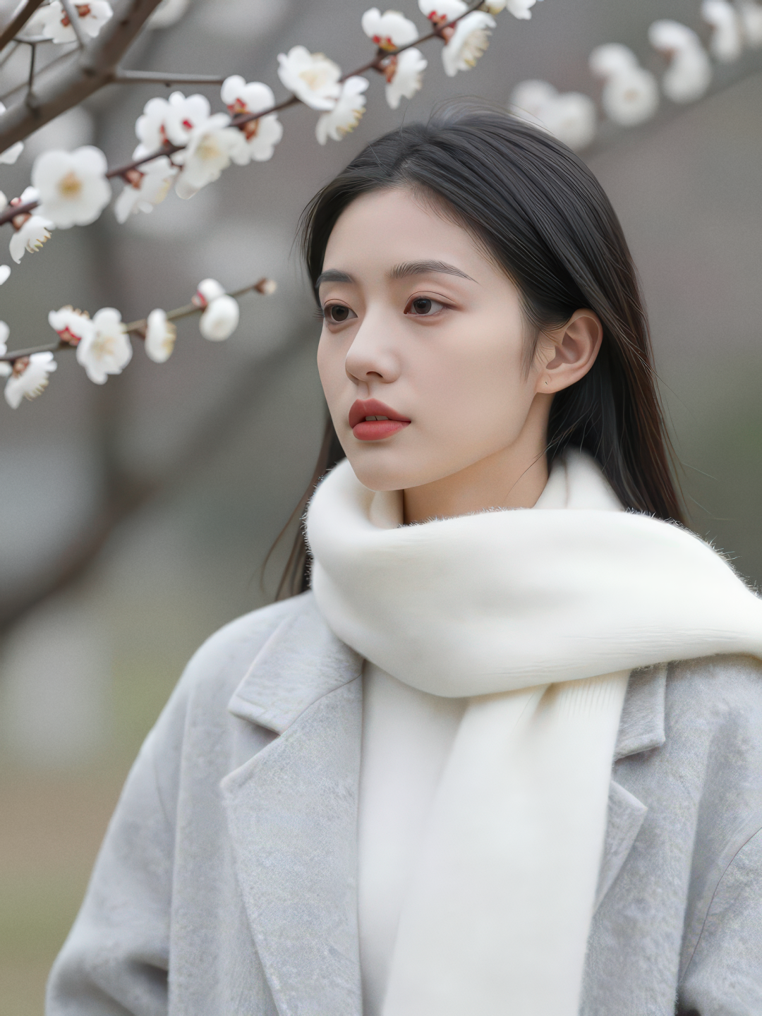 东亚年轻女性,皮肤白皙,脸型修长,鼻梁挺直,唇形柔和。身穿浅灰色羊毛长大衣,搭配白色针织围巾,与白梅色调统一的极简冬装。妆容干净克制,淡眼妆、豆沙色唇妆。人物侧脸望向头顶白梅花枝,神情平静内敛。白梅花作为前景与背景轻柔虚化。竖构图,特写人像,浅景深,高细节,柔和冬日散射光,专业摄影画质。