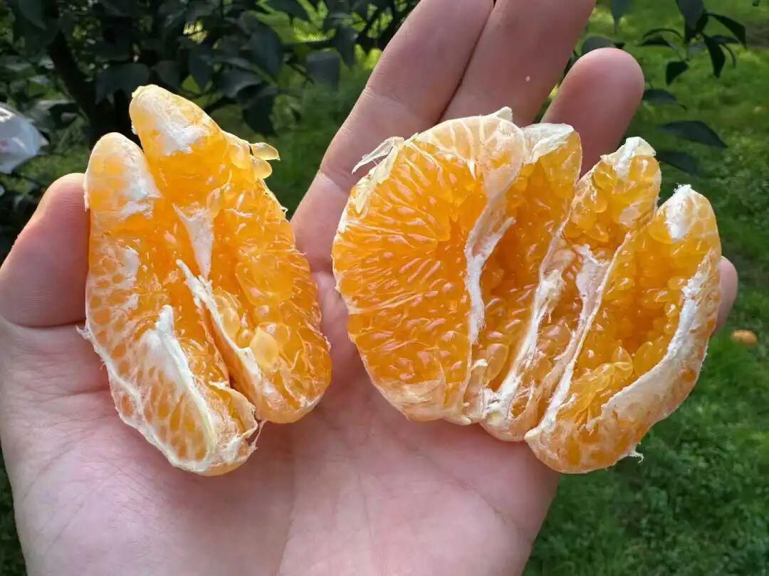 成熟的耙耙柑掰开是黄灿灿的果肉,像排列整齐的鱼子酱,粒粒分明,细嚼没有一点渣,只有浓浓柑橘香味!