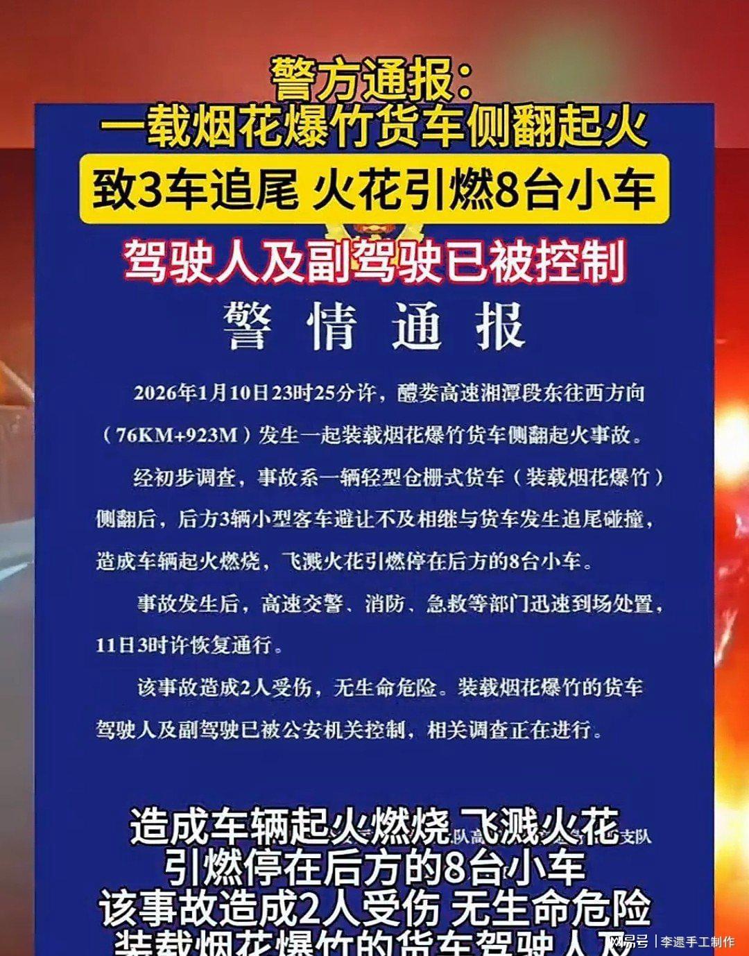 2026年1月11日,湖南警方通报了昨晚(10日)深夜醴娄高速湘潭段,一辆载着烟花爆竹的货车侧翻起火引发的交通事故——