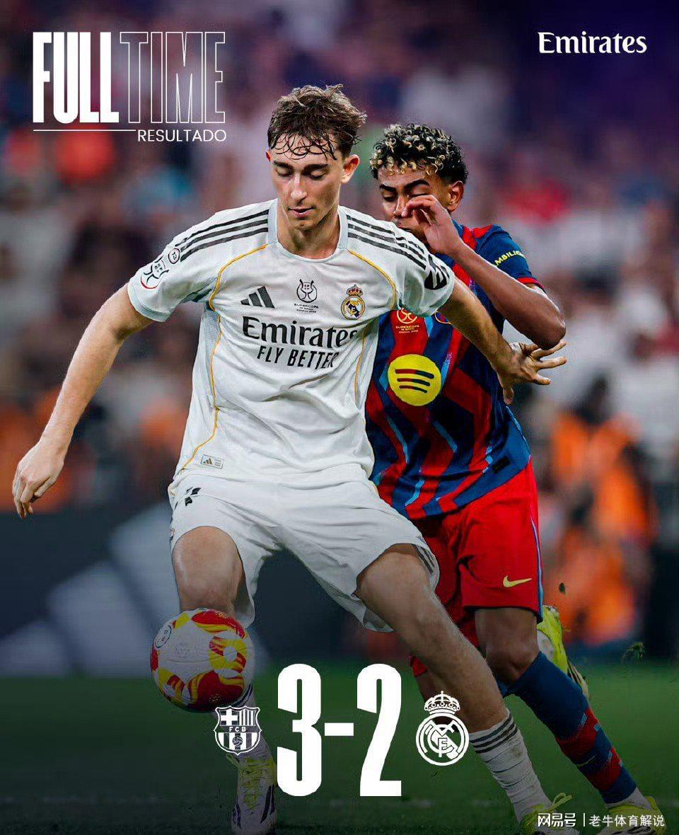 易边再战巴萨依旧占据场面优势,皇马继续寻找防反机会,两队展开对攻。进行到第73分钟时,奥尔莫和费兰在大禁区前沿打出撞墙配合后送出斜传,拉菲尼亚在弧顶位置右脚兜射击中阿森西奥折射破门完成梅开二度,巴萨取得了全场第3次比分领先。接下来两队连续做出换人调整,伤愈复出的姆巴佩也来到了场上,常规时间最后一分钟姆巴佩在回防时断下亚马尔脚下皮球,随后德容上前蹬踹放倒姆巴佩,裁判直接对德容出示了红牌!伤停补时阶段拉什福德错失单刀,卡雷拉斯左脚推射太正被没收,楚阿梅尼头球攻门也被加西亚抱住,最终场上比分并未改变,巴塞罗那3-2击败了皇家马德里,拿下了第263次国家德比的胜利,队史第16次捧起西超杯冠军奖杯!