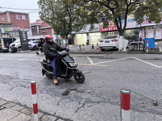 记者沿川周公路继续向东,两侧城市面貌逐步由城市转为城乡结合部。转折点似乎在周市路路口处,路口的“小上海休闲广场”提示着路人这里属于周浦镇中心区域。但即便如此,周市路路口一过,川周公路路况急剧变差。记者骑行的共享单车从龙头处传递来强烈的颠簸感,一手拿手机导航一手把着龙头骑行变得十分困难。只见轮子下方的路面布满龟裂纹,频繁的修补留下了大量高低起伏的黑色补丁,还没来得及修补处则明显沉降凹陷,一些区域索性裸露着坑塘。马路两侧也没有人行道,道路边缘处插有红白相间的隔离桩,围出来区域或被作为停车场,或被商家拿来占道经营。因而,汽车、非机动车全挤在狭窄的车道内,行人则只能紧紧贴着路边谨慎通行。
