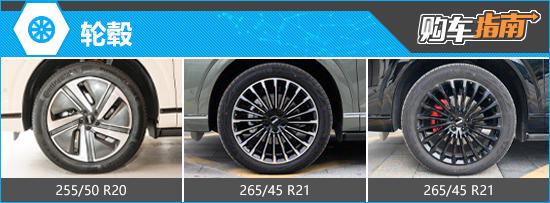 轮毂方面,四驱Max和四驱Max+标配20英寸轮毂,造型十分科幻,与之匹配的轮胎规格为255/50 R20。此外,两款车型还可选装21英寸多辐亮面轮毂以及21英寸多辐熏黑轮毂(需关联黑武士专属套件),视觉效果更为出色,与之匹配的轮胎规格为265/45 R21。四驱Ultra黑武士则标配21英寸多辐熏黑轮毂。