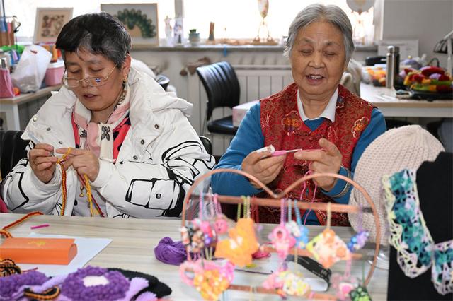 1月9日,在石家庄市新华区北环路社区“微工坊”,社区居民在制作针织手工艺品