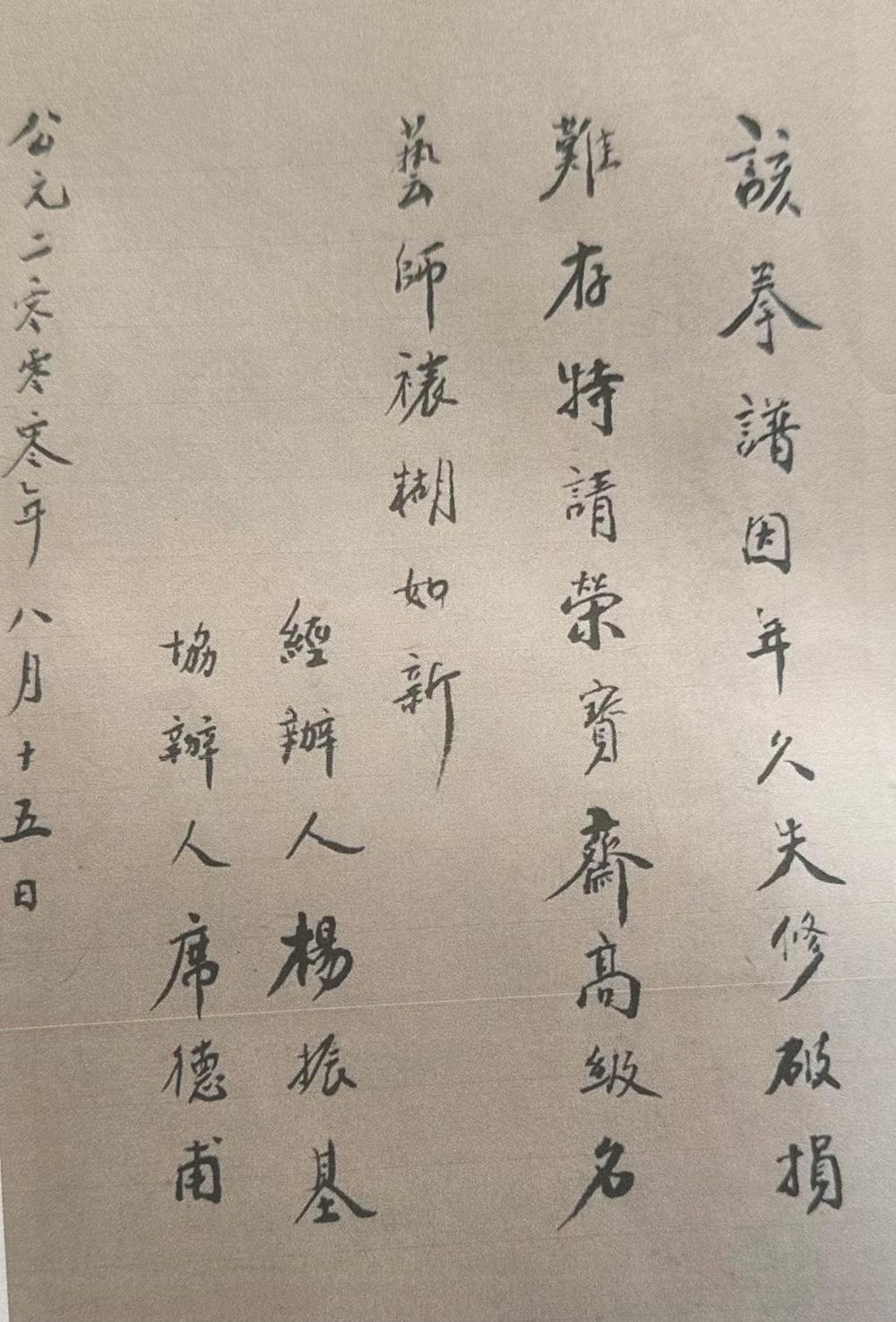 2000年8月,杨振基在席德甫协办下,到荣宝斋对老拳谱进行了修复装裱。他在拳谱的末页中注明:“该拳谱因年久失修,破损难存,特请荣宝斋高级名艺师裱糊如新。”修复装裱后的老拳谱定名为《杨澄甫式太极拳谱》。