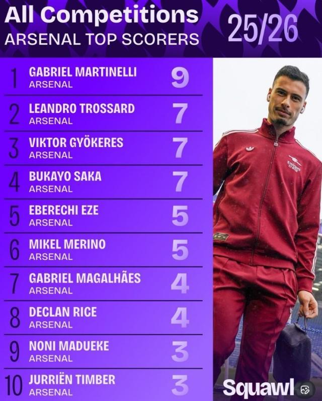 在足总杯阿森纳4比1击败朴茨茅斯,马丁内利上演帽子戏法。以下为本赛季各项赛事阿森纳球员进球榜: