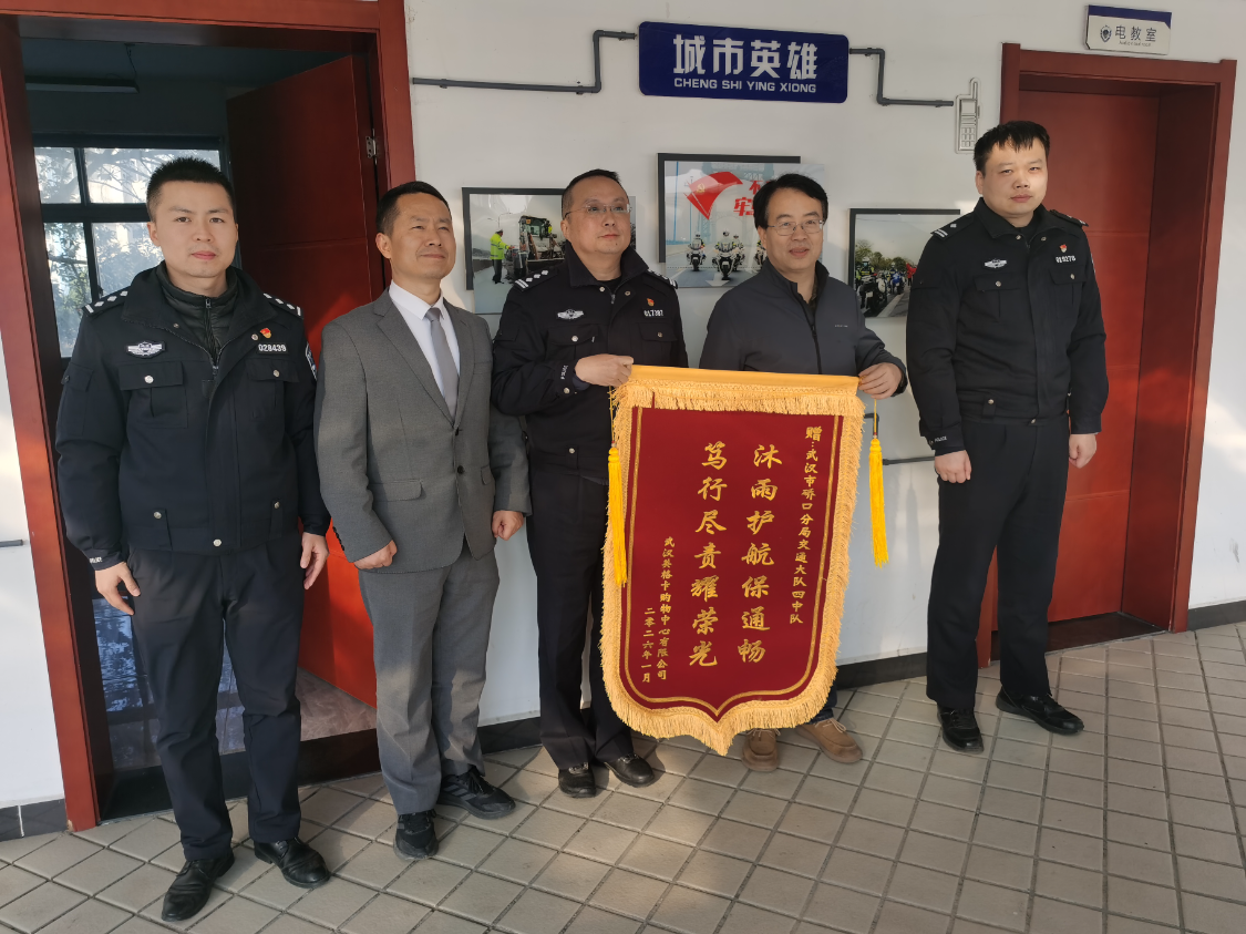 警察节前夕,武汉宜家荟聚购物中心安保部负责人,为硚口交警送来“礼品”——一面印有“沐雨护航保畅通 笃行尽责耀荣光”字样的锦旗。