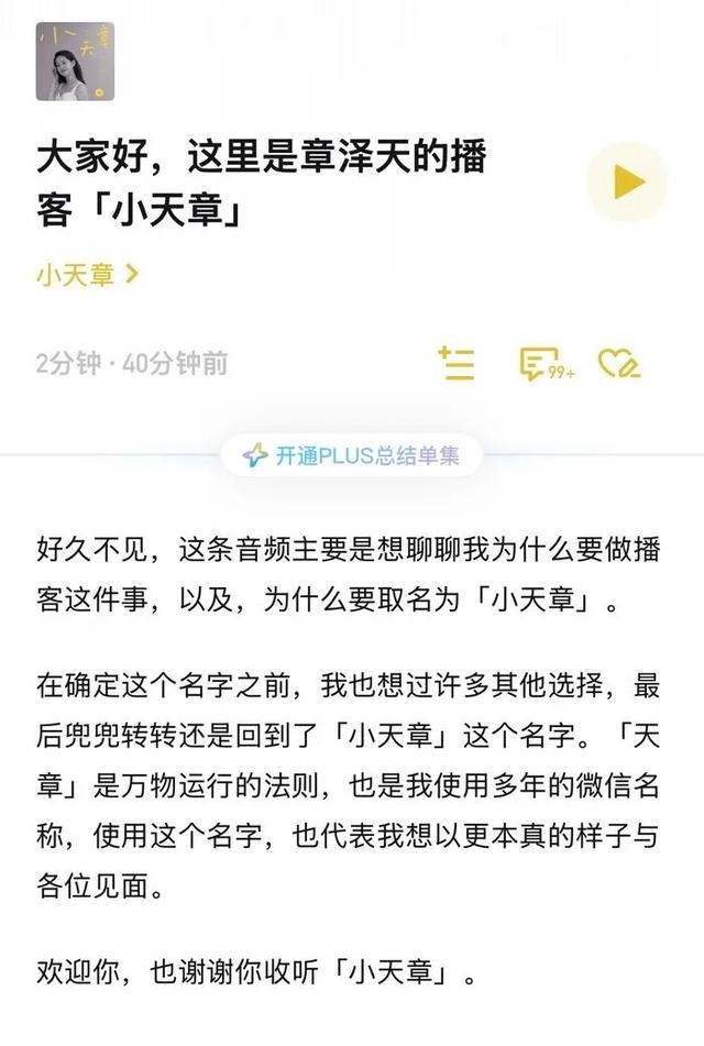 章泽天用自己微信名“小天章”开播客,称将分享对生活的思考