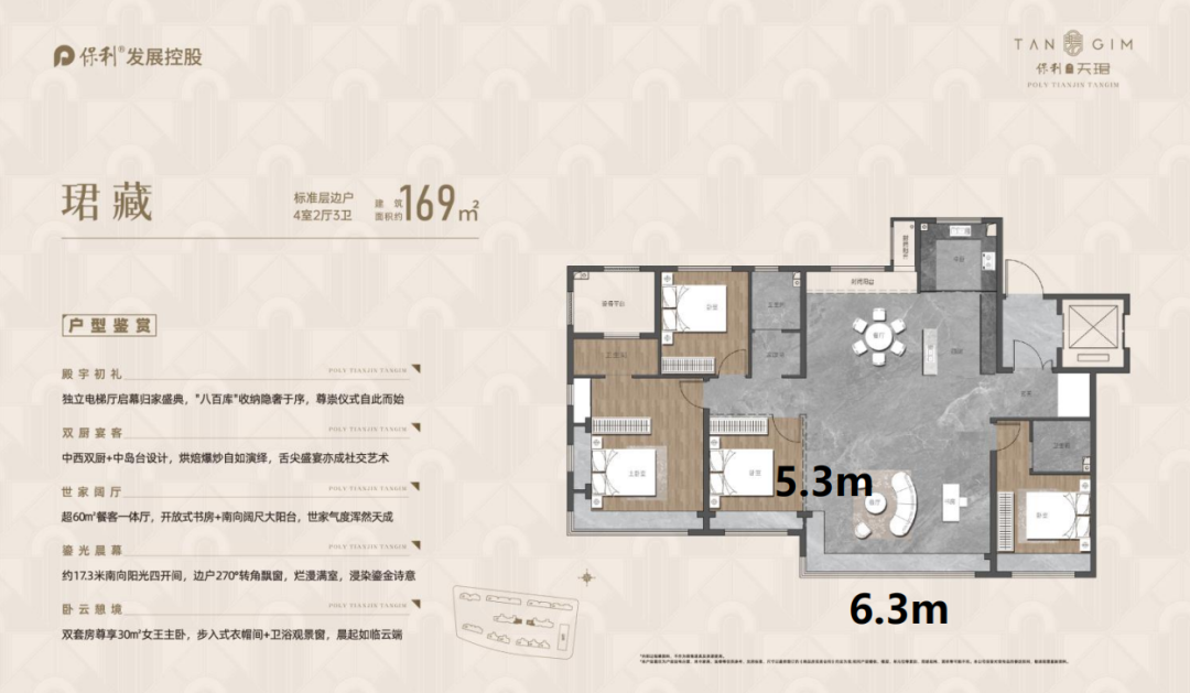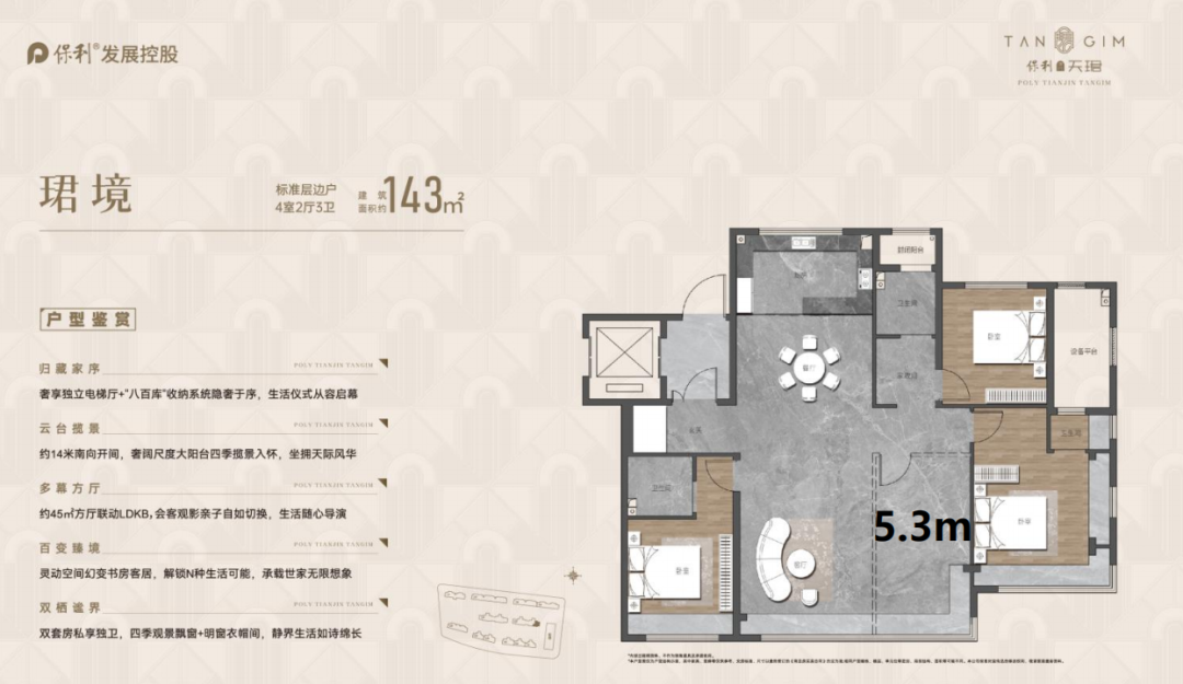 保利津门天珺标准层最大户型是四室三卫宽厅的169㎡,顶跃产品接近200㎡,纯改善定位无疑,未来会在实体楼呈现。目前样板间最大143㎡,同样是可变四室三卫,但升级了双套房。