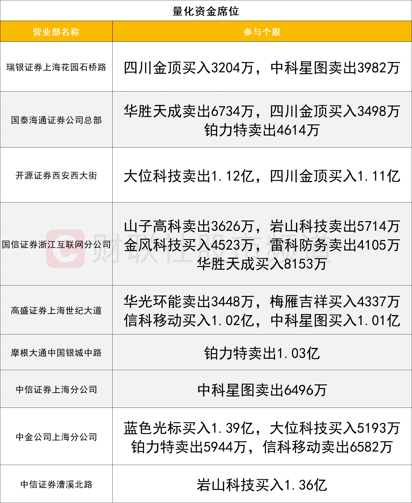 量化资金活跃度较高,大位科技今日炸板回落,其中一家量化资金(中金公司上海分公司)买入5193万,而一家量化资金(开源证券西安西大街)卖出1.12亿。