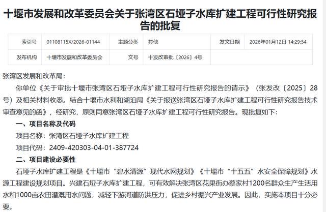 十堰市发展和改革委员会关于张湾区石垭子水库扩建工程可行性研究报告的批复
