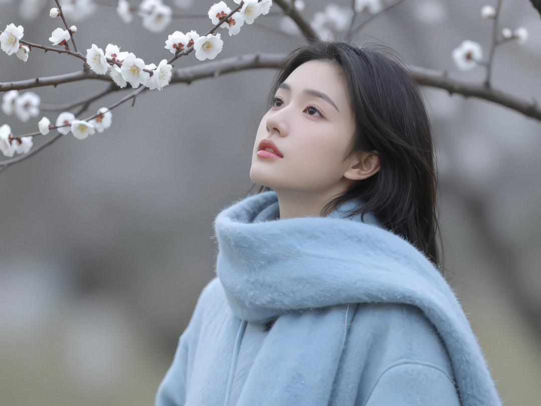 东亚年轻女性,皮肤白皙,气质清新而克制。身穿雾霾蓝色冬季外套,现代简洁风格。妆容自然柔和,唇部微微光泽。人物站在白梅枝下抬头望花,神情放松平和。横构图,近景至中景,背景柔和虚化,高画质,冬日散射光,安静电影氛围。