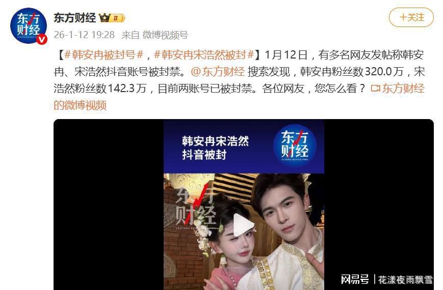 2026年1月12日,网红圈迎来一次“清网式”震动。坐拥粉丝合计超460万的头部网红韩安冉与宋浩然,其抖音主账号被平台同步封禁,内容全部清空。这记“终局处罚”的重锤落下,被广泛解读为平台对一场持续三年、反复以婚变互撕博取眼球的“流量连续剧”的最终清算。