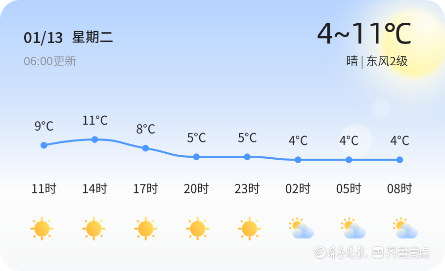今天是1月13日,星期二,农历十一月廿五。济南市今日天气晴朗,气温在4℃到11℃之间,东风2级,空气湿度为37%。空气质量状况为良好(PM2.5指数为80),适合市民户外活动。市民出行时建议根据实时温度增减衣物,注意保暖。今天的天气适宜进行户外运动和日常活动。