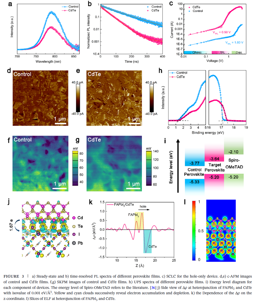微观p-n异质结创新构建:通过激光合成在钙钛矿表面及晶界嵌入p型CdTe量子点,形成分布均匀的微观p-n结,产生强单向内建电场,显著促进载流子定向分离与传输,同时扩展耗尽区抑制复合。