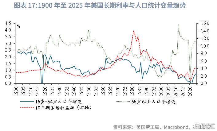 以英国主导的第一轮债务周期来看,长期利率整体可控且在后期保持相对平稳,主要源于两方面因素:其一是制度优势的支撑,使得英国国债成为了全球稀缺的安全资产;其二是人口增速与工业增速逐渐走平,同时通缩预期较强,共同压低了利率中枢。