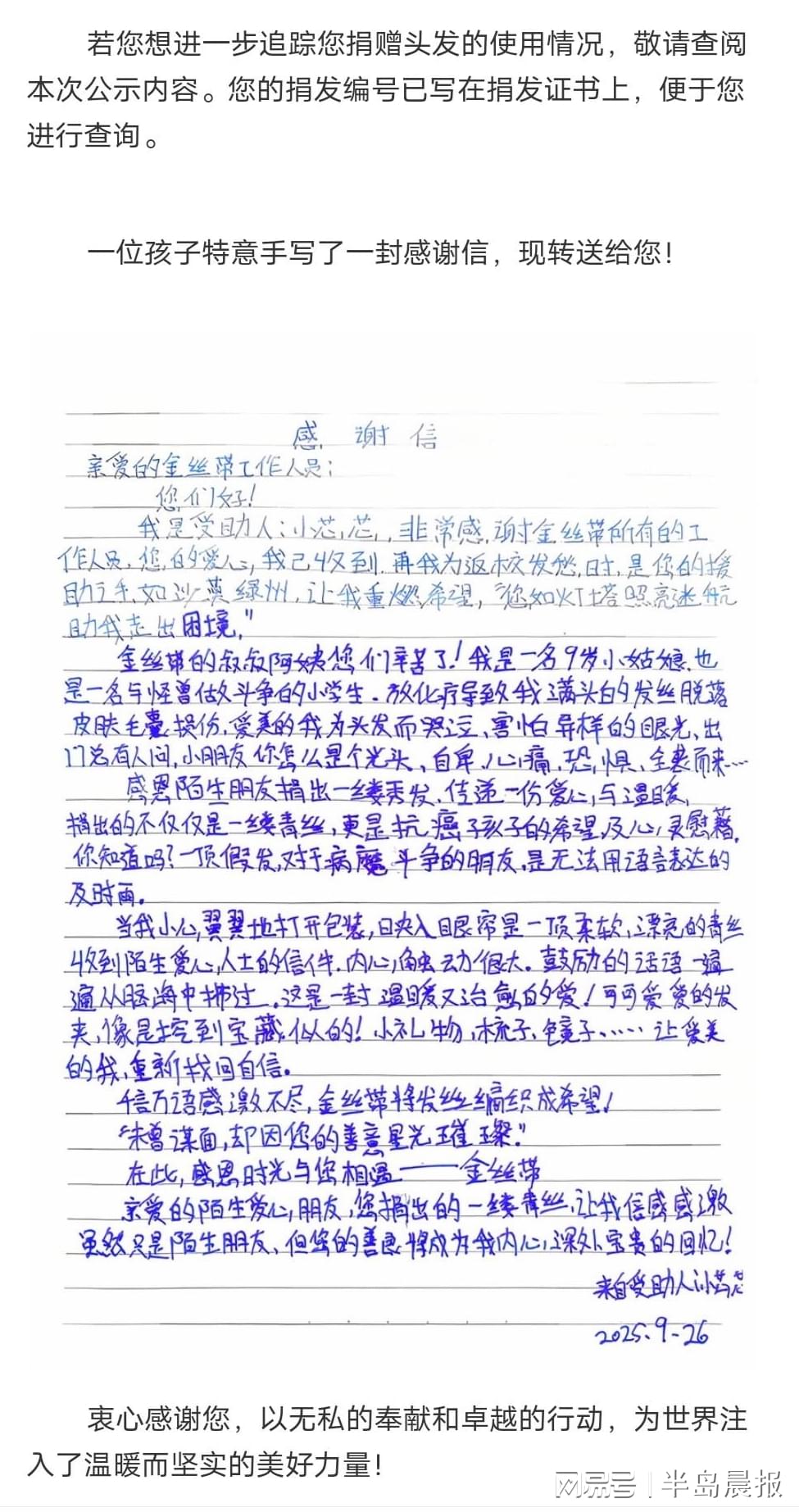 据悉,广州金丝带是专注服务癌症儿童家庭的公益机构,其“为爱发生”项目通过收集捐赠头发制作假发,免费赠予3-17岁光头癌症女孩,助力患儿重建自尊与自信。