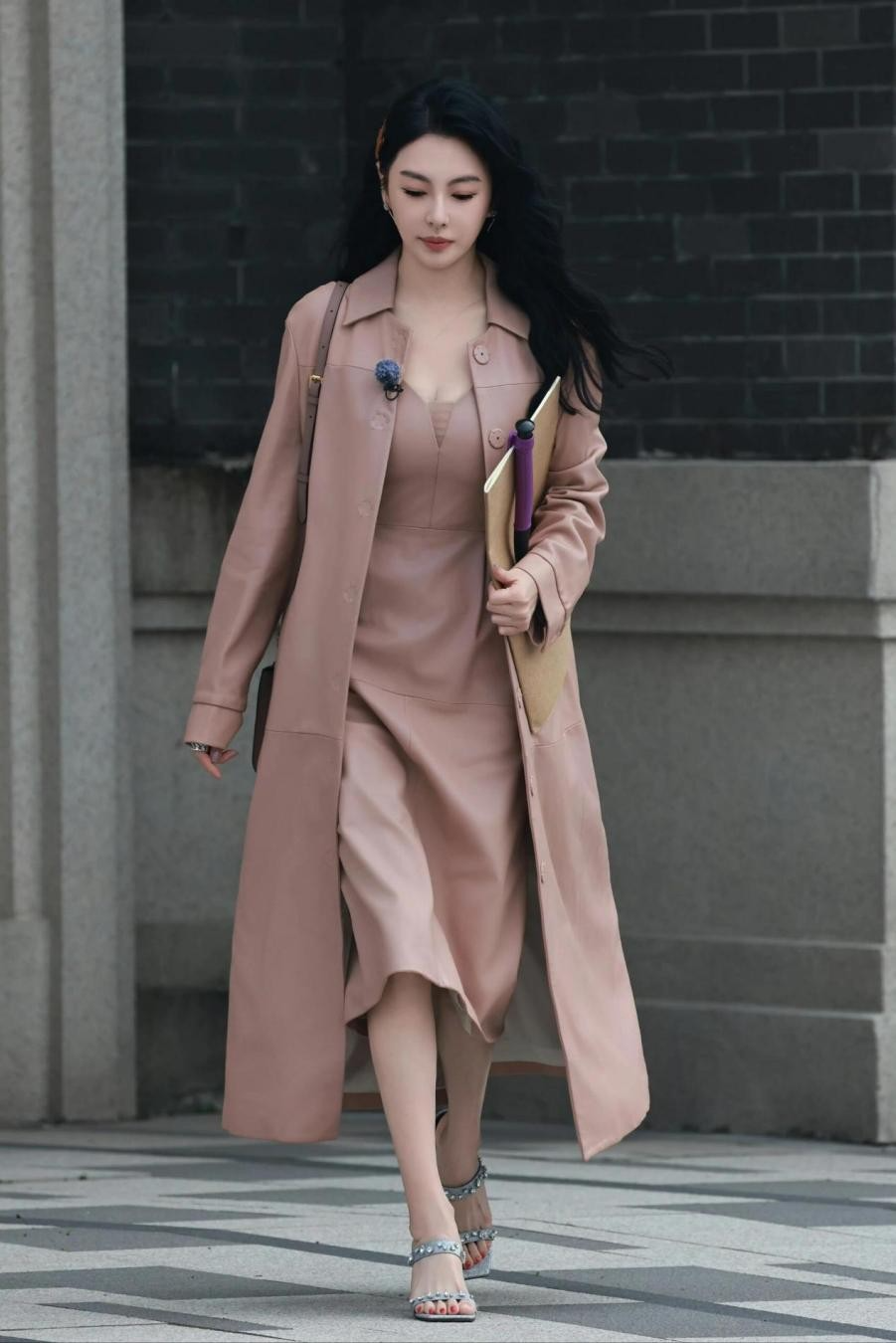身高166cm的张雨绮轻松驾驭了几乎及踝的大衣长度,脚踩高跟凉鞋营造“上暖下凉”的视觉冲击。这种大胆的混季穿搭,在她身上却毫无违和感,反而成就了一组出圈的街拍大片。