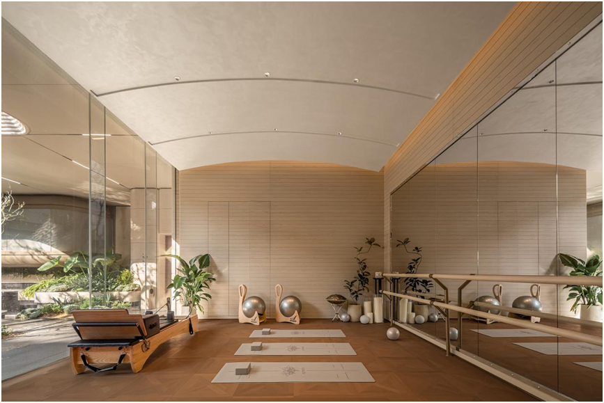 自然贯穿了整个社区公区的设计语言,整体约1200㎡立体会所+约1700㎡主题架空层,配备了私宴厅、瑜伽室、棋牌室等休闲空间。