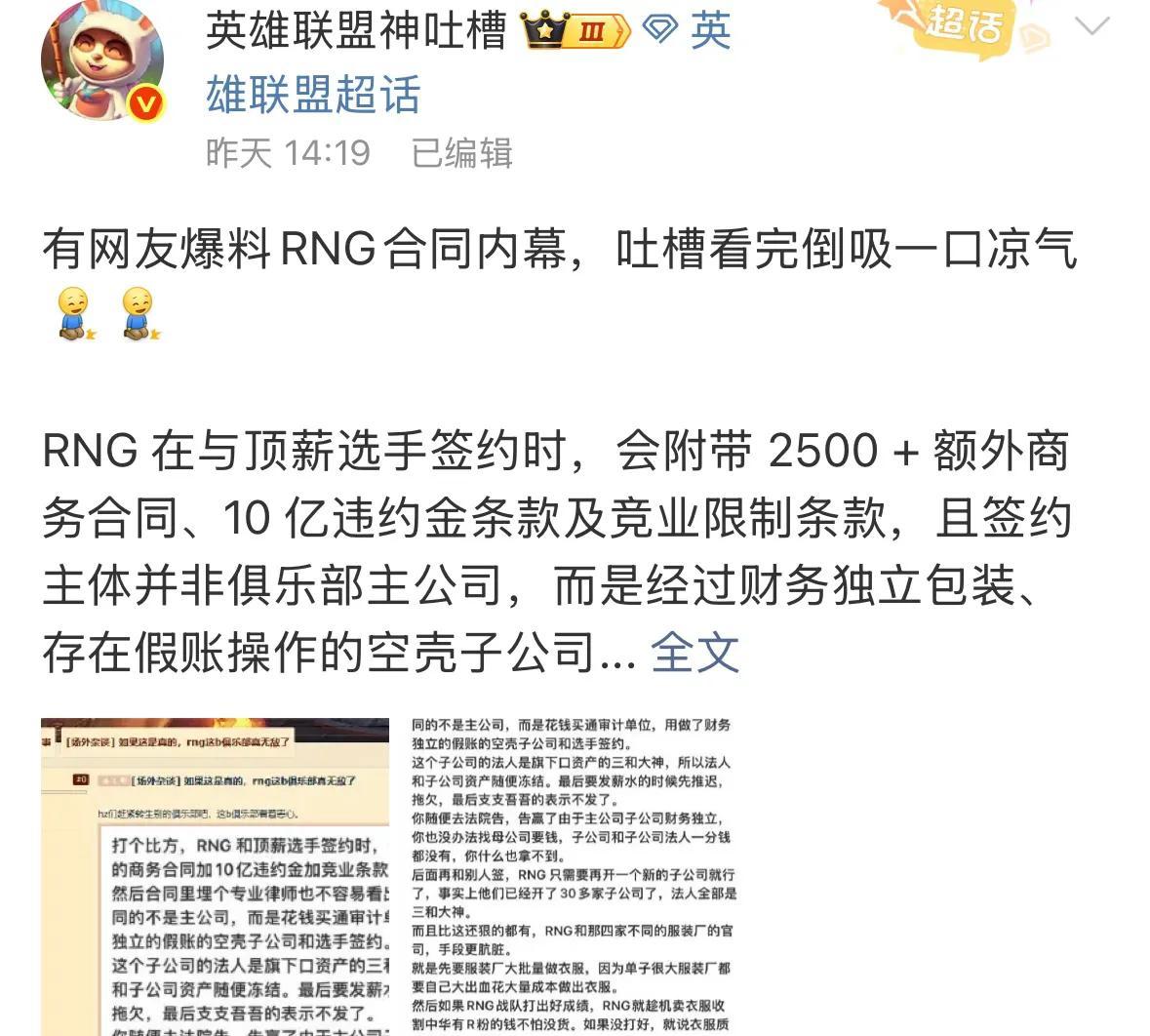 除此之外,RNG跟选手签的合同里,主体公司并不是本体,而是对方在外开的一家子公司,并且这家子公司和母公司的财务完全独立,也就是说,如果Rng一方造成了违约,选手拿着合同去上诉,就算官司赢了,也很难拿到钱,因为这家子公司本来就是套壳,甚至公司的董事长都是不知名的三和大神,身上一分钱都没有
