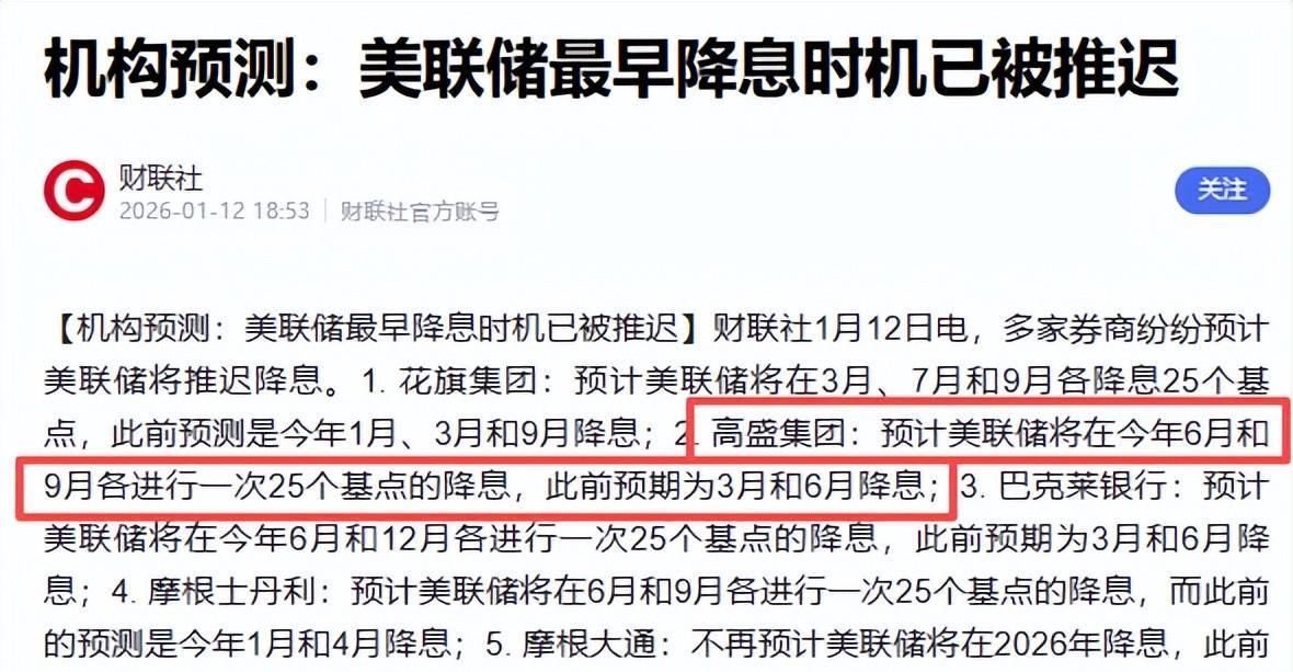 高盛最新预测显示,美联储将在2026年6月和9月各进行一次25个基点的降息。