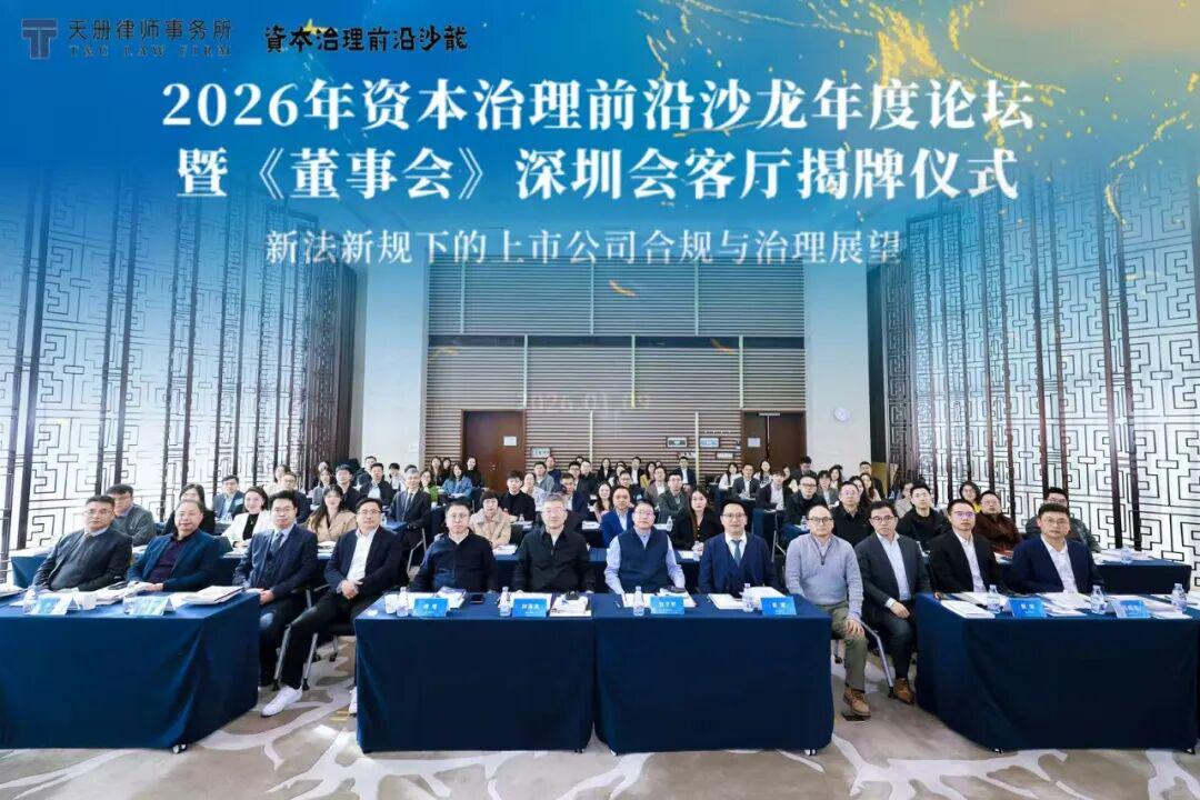 2026年1月9日下午,由凤凰出版传媒集团《董事会》杂志指导、天册(深圳)律师事务所主办的“2026年度资本治理前沿沙龙年度论坛暨‘董事会深圳会客厅’揭牌仪式”在资本市场学院圆满落幕。本次论坛的主题是“以新法新规背景下的上市公司合规与治理展望”。来自全国各地近50家上市公司高管、行业翘楚与法学精英济济一堂,共同论道宏观经济趋势及强监管下的资本市场前瞻趋势,上市公司如何更好地实现合规治理。