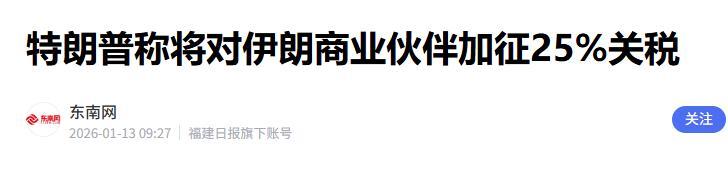 东南网2026-01-13特朗普称将对伊朗商业伙伴加征25%关税