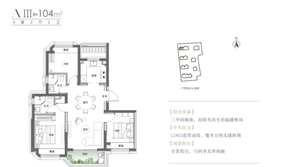 建面约104㎡的两房两厅两卫是舒适的大两房设计,主要分布于小区西侧和头排,视野相当出众。