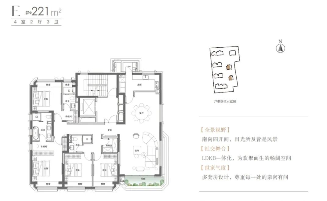 真一梯一户的双玄关设计+南向四开间+完整的动静分区+多套房设计,南向约16m的连续采光面,东侧较高楼层享受令人向往的广阔视野。适合一家四口或三代同堂家庭居住,这是真正的终极改善产品、家族传承之作。